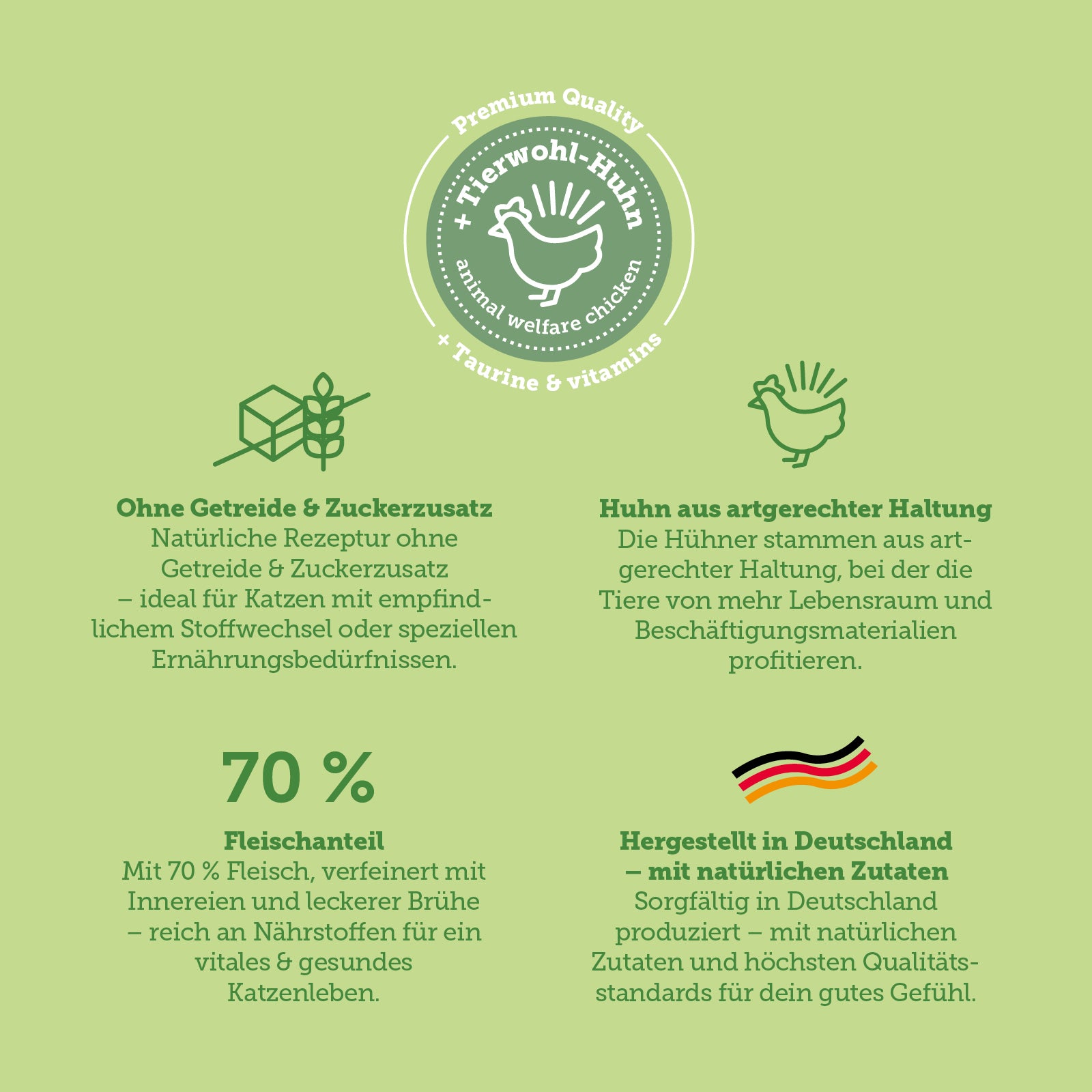 Unser Nassfutter enthält 70 % Fleisch und Innereien – kombiniert mit leckerer Brühe. So bekommt deine Katze wertvolle Proteine und Nährstoffe für ein rundum vitales Leben.
