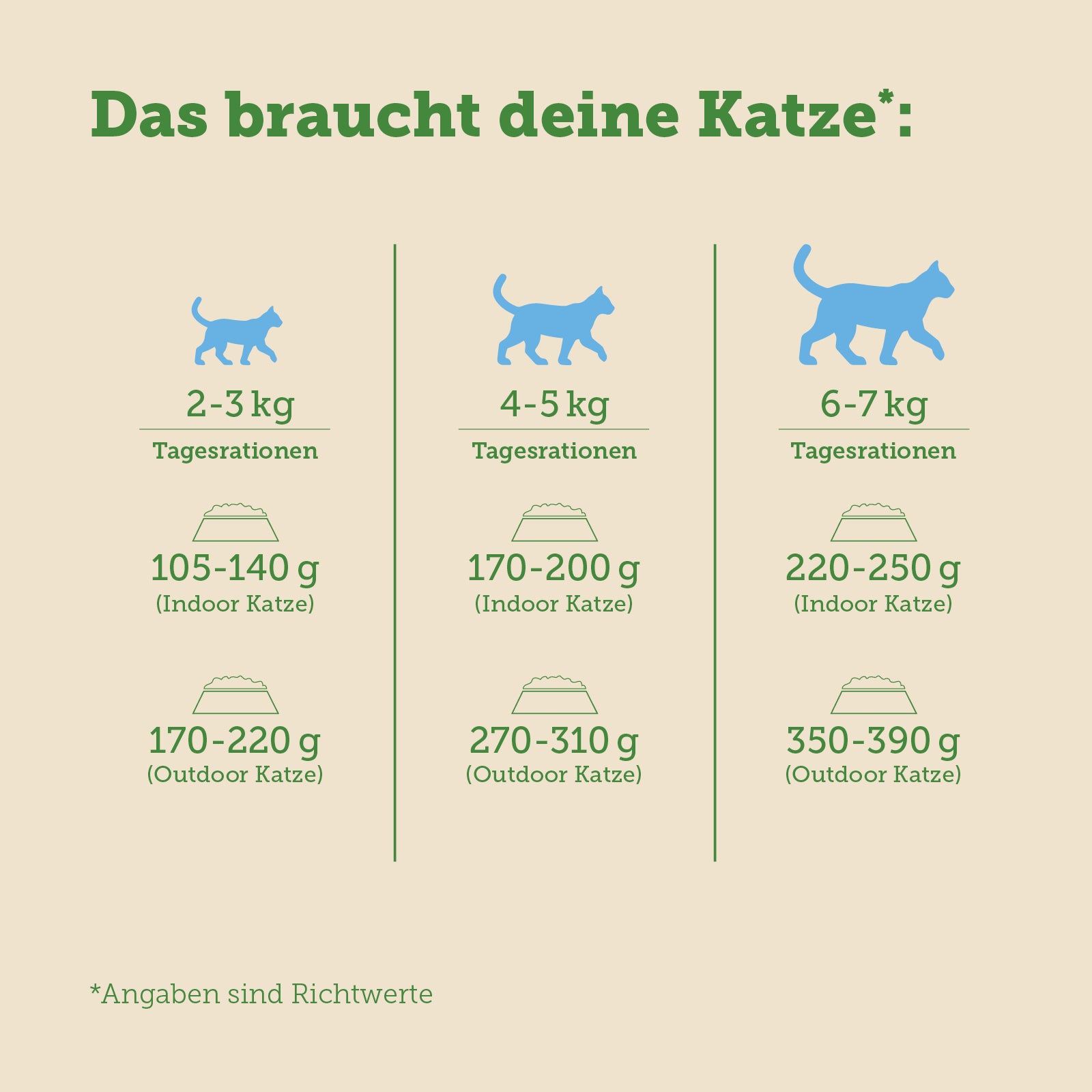 Bitte betrachte die angegebene Fütterungsempfehlung lediglich als Richtwert für eine ausgewogene und bedarfsgerechte Ernährung deines Hundes bzw. deiner Katze. Diese Angaben wurden nach den neuesten wissenschaftlichen Erkenntnissen errechnet, müssen jedoch unbedingt den individuellen Bedürfnissen angepasst werden. Denn es ist unmöglich, mit einer einzigen Zahl allen individuellen Unterschieden und Bedingungen wie Rasse, Alter, Größe, Bewegungsleistung, Umwelteinflüssen (Wetter, Jahreszeit) etc. gerecht zu werden.