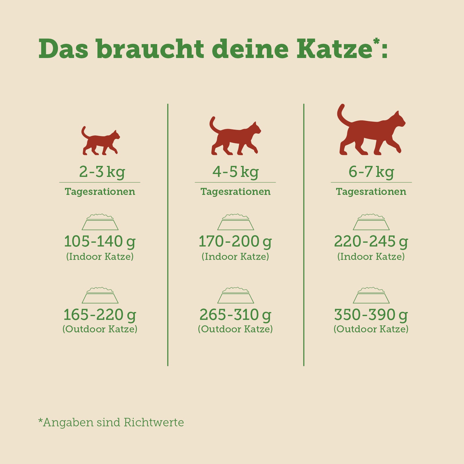 Bitte betrachte die angegebene Fütterungsempfehlung lediglich als Richtwert für eine ausgewogene und bedarfsgerechte Ernährung deines Hundes bzw. deiner Katze. Diese Angaben wurden nach den neuesten wissenschaftlichen Erkenntnissen errechnet, müssen jedoch unbedingt den individuellen Bedürfnissen angepasst werden. Denn es ist unmöglich, mit einer einzigen Zahl allen individuellen Unterschieden und Bedingungen wie Rasse, Alter, Größe, Bewegungsleistung, Umwelteinflüssen (Wetter, Jahreszeit) etc. gerecht zu werden.