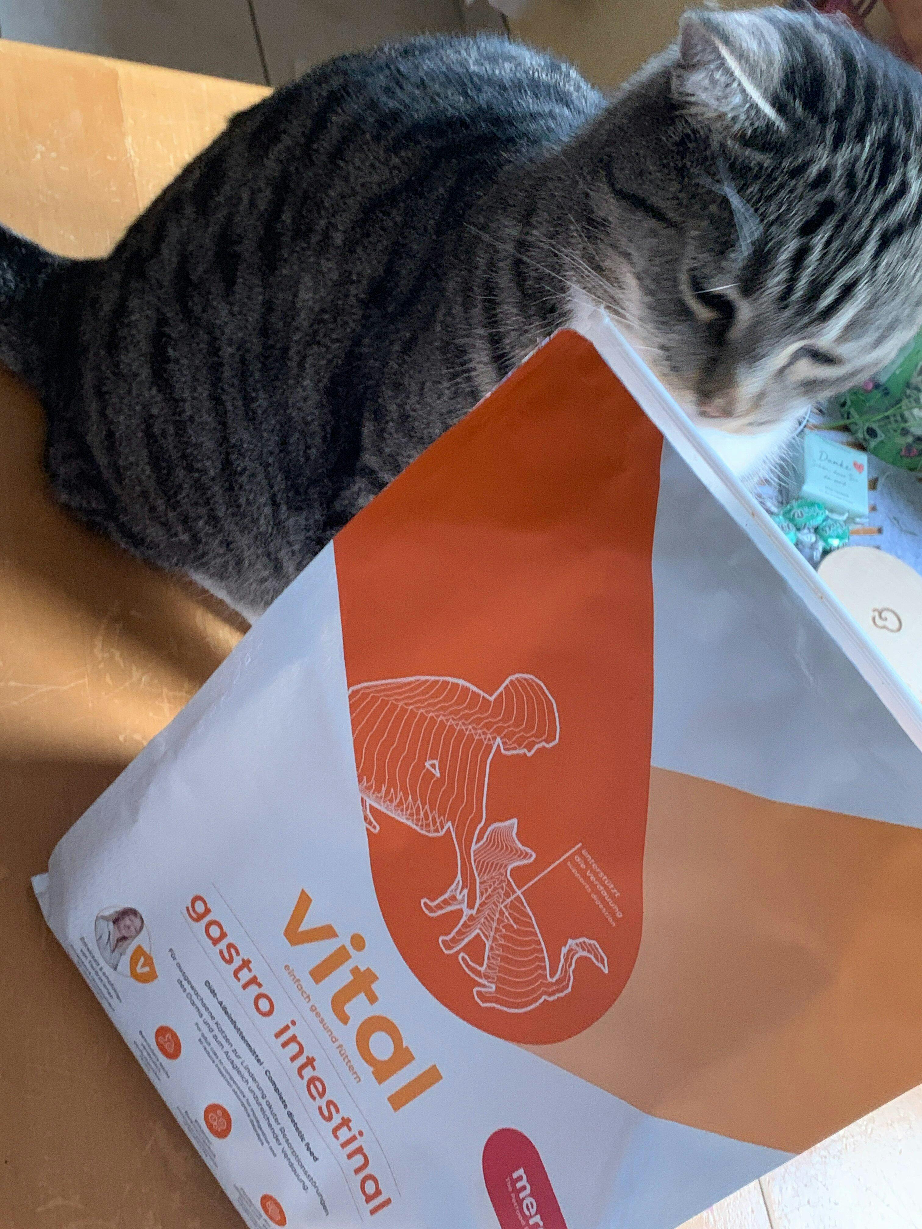 Leider hatten wir Anfang des Jahres Giardien und deshalb schlimmen Durchfall. Nachdem wir diese komischen weißen Dinger täglich essen mussten, Tabletten oder sowas, hat Mama uns dieses Futter gekauft. Es war wirklich lecker, so lecker das wir uns durch den Sack fressen wollten, aber Mama ist ein Spielverderber und hat uns beim Plündern erwischt. Der Durchfall ging auch ganz schnell weg.