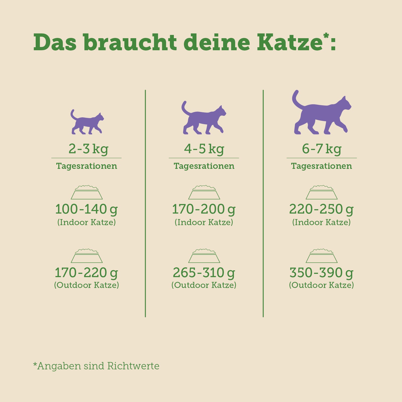 Bitte betrachte die angegebene Fütterungsempfehlung lediglich als Richtwert für eine ausgewogene und bedarfsgerechte Ernährung deines Hundes bzw. deiner Katze. Diese Angaben wurden nach den neuesten wissenschaftlichen Erkenntnissen errechnet, müssen jedoch unbedingt den individuellen Bedürfnissen angepasst werden. Denn es ist unmöglich, mit einer einzigen Zahl allen individuellen Unterschieden und Bedingungen wie Rasse, Alter, Größe, Bewegungsleistung, Umwelteinflüssen (Wetter, Jahreszeit) etc. gerecht zu werden.
